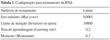 MATERIAL E MÉTODOS Este trabalho foi feito utilizando o software livre NEUROPH v2.8, disponível para download.15 Pode-se ter acesso ao sistema INFOÁGUAS, da CETESB, através do sítio na internet,16 a partir do qual estão disponíveis dados de análises de águas dos diversos mananciais do Estado. Assim, com o objetivo de se fazer um experimento com o treinamento de redes neurais utilizando-se dados reais, foram reunidas informações sobre o Rio Paraíba do Sul. Os dados, totalizando 155 amostras, são oriundos do ponto de coleta PARB 02310, localizado na ponte de acesso ao loteamento Urbanova no município de São José dos Campos -SP, nas coordenadas 23º 11' 45.0348" sul de latitude e 45º 55' 49.3032" oeste de longitude. Buscaram-se dados de onze parâmetros físico-químicos, coletados e analisados entre 18/01/90 e 05/12/12: Temperatura da água, pH, Demanda Bioquímica de Oxigênio (DBO), Condutividade, Nitrogênio Amoniacal, Nitrato, Nitrito, Fósforo, Turbidez, Sólidos Dissolvidos Totais e Oxigênio Dissolvido. Os parâmetros de inicialização da RNA para todos os experimentos foram padronizados e estão apresentados na Tabela 1: