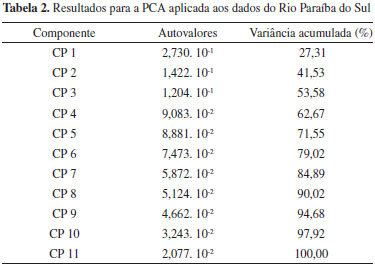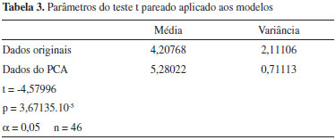 A maior amplitude e menor linearidade dos dados reais advindos das amostras do rio Paraíba do Sul terminam por produzir maiores diferenças entre os valores originais e modelados pela RNA. Para confirmar estas diferenças foi feito um teste t pareado entre os pares de dados dos parâmetros originais e os obtidos pelo método de PCA, buscando verificar se há diferenças estatisticamente significativas (Tabela 3). O resultado do teste mostra que existem diferenças entre os modelos com 95% de confiança (α = 0,05). O modelo obtido com o método PCA produziu resultados melhores para este ponto de amostragem quando comparados com o modelo utilizando dados reais (10 entradas), o que pode ser também confirmado pelo valor de coeficiente de correlação calculado em 0,761.