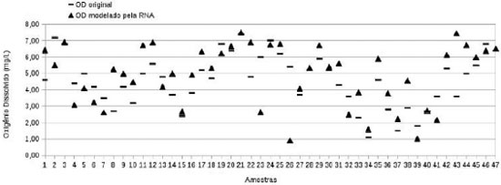 Ao final do teste, a aplicação disponibiliza o valor do erro quadrático médio (Total Mean Square Error), calculado a partir dos erros obtidos do teste. No caso da arquitetura (10-8-1) para o Rio Paraíba do Sul, este erro é de 4,21 x 10-2. A partir do treinamento da rede de arquitetura (10-8-1), é possível normalizar inversamente os dados de saída (output) da rede com a finalidade de verificar a distância destes dados com o alvo do treinamento, o valor real de Oxigênio Dissolvido. A Figura 3 apresenta os valores iniciais da variável OD, antes de serem padronizados e utilizados no conjunto de teste, contra o OD modelado pela rede, depois da efetuada a normalização reversa. Verifica-se que, com erro quadrático médio alto desta arquitetura, as diferenças entre os valores originais e modelados são consideráveis, o que pode ser confirmado pelo valor do coeficiente de correlação, calculado em 0,428, suscitando a necessidade de mudanças nos parâmetros de treinamento em busca de valor de erro menor.