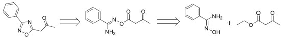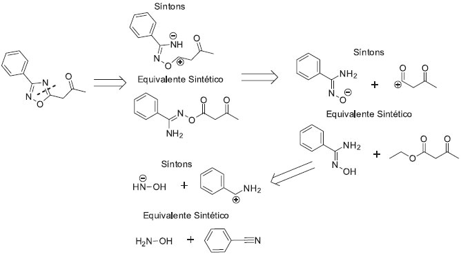 A abordagem retrossintética consistiu basicamente em transformar a estrutura da molécula-alvo em uma sequência de estruturas progressivamente mais simples, clivando esta em seçoes conhecidas como síntons (fragmentos da molécula instáveis que nao sao encontrados de forma isolada, mas apenas combinados) (Esquema 2). Neste momento, os conceitos de polaridade latente (carga parcial que cada átomo da molécula possui) do 1,2,4-oxadiazol pôde ser discutido em uma aula expositiva dialogada e, em seguida, foram propostas as desconexoes para a molécula-alvo. Cada uma das etapas do retrocesso é representada por uma seta dupla (⇒), enquanto o símbolo (----) é desenhado sobre a ligaçao quebrada na molécula-alvo. Cada um dos síntons possíveis é convertido em um composto real conhecido, o equivalente sintético. A análise é repetida com os reagentes de cada etapa da retrossíntese até que os materiais iniciais prontamente disponíveis sejam obtidos.