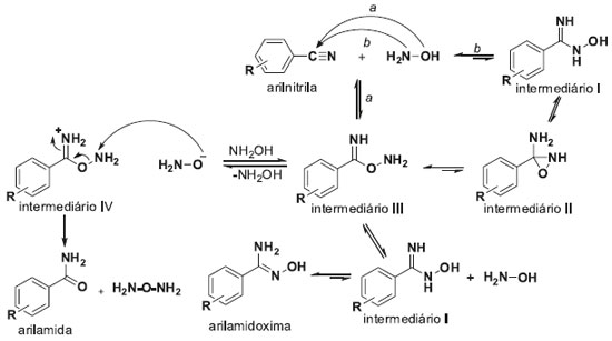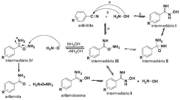 Ainda neste momento, a partir da retrossíntese foi preciso pensar em moléculas disponíveis comercialmente ou mesmo que possam ser sintetizadas, que poderiam gerar esses mesmos síntons. Em seguida foi proposto um esquema reacional para preparaçao do 1,2,4-oxadiazol desejado (esquema 3). ![]() Esquema 3. Proposta de reaçao para obtençao do 1,2,4-oxadiazol No final da aula e com a finalidade de reforçar o conhecimento foram elaborados mapas conceituais como estratégia de ensino, que teve como objetivo permitir que os estudantes esquematizassem como proceder diante do problema de como preparar determinado composto. Diante dos mapas construídos pelos estudantes foi possível perceber que eles nao consideraram muito a proposta de montar os esquemas na forma de um mapa conceitual utilizando caixas de texto. Todos os estudantes esquematizaram o conhecimento na forma de texto e/ou em tópicos. Alguns estudantes discorreram muito bem sobre os objetivos da análise retrossintética. Como exemplo, destaca-se a fala do estudante A1 "o estudo de uma análise retrossintética pode ser realizado para nortear o planejamento teórico que proponha a melhor ou mais acessível rota sintética para determinada síntese". Pela fala do estudante, percebe-se que as atividades anteriores contribuíram para a construçao do conhecimento científico de forma efetiva. No terceiro momento da sequência didática aplicou-se a aula prática experimental sobre a preparaçao de 1,2,4-oxadiazol. Para facilitar a execuçao do experimento, dividiram-se seis estudantes em três bancadas contendo cada grupo, duas pessoas. Todos os materiais necessários para a realizaçao da prática já se encontravam devidamente preparados e separados sobre as bancadas. Neste momento, os estudantes pesaram os reagentes, homogeneizaram a mistura conforme procedimento experimental e colocaram no forno de micro-ondas por 7 a 9 minutos. Conforme a proposta investigativa da SD, foi estudado o mecanismo de obtençao do reagente arilamidoxima, no qual o oxigênio da hidroxilamina realiza um ataque nucleofílico no carbono polarizado positivamente da nitrila, formando um intermediário que sofre rearranjos intramoleculares até chegar à estrutura da arilamidoxima, Esquema 4. Ao propor o mecanismo de obtençao da amidoxima foram revisados conceitos de estabilidade de reagentes, ácidos e bases de Bronsted, funçoes orgânicas.