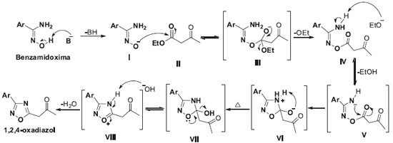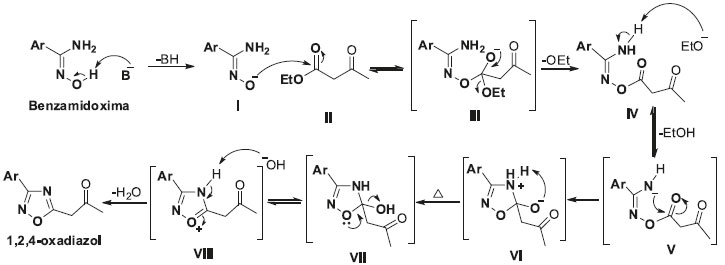 O término da reaçao de obtençao do 1,2,4-oxadiazol e a realizaçao da cromatografia em camada delgada permitiu a revisao de conteúdos como: polaridade, cromatografia, solubilidade e fator de retençao. Ainda nesse momento foi proposto e discutido o mecanismo de obtençao do 1,2,4-oxadiazol. O mecanismo de reaçao proposto para a formaçao do 1,2,4-oxadiazol é mostrado no Esquema 5. Inicialmente, a remoçao do próton ácido de I com uma base adequada cria um anion no átomo de oxigênio, e este ataca a carbonila de II e fornece uma espécie instável tetraédrica III com subsequente perda de etanol para fornecer IV. Posteriormente o composto IV é convertido no V pela abstraçao do próton de IV e quebra da ligaçao N-H, com o par de elétrons migrando para o átomo de nitrogênio. Em seguida, este intermediário é ciclizado para fornecer VI, que sofre eliminaçao da água por aquecimento (intermediário VII e VIII) para produzir 1,2,4-oxadiazol objeto do estudo.
