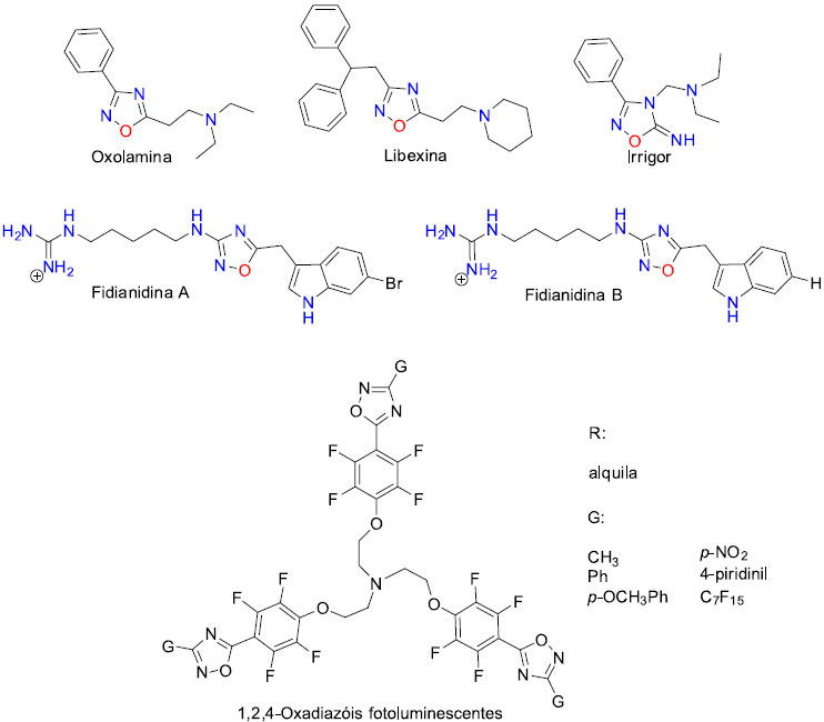 Os 1,2,4-oxadiazóis apresentam diversas atividades biológicas já descritas na literatura, no qual alguns destes compostos exibem acentuadas propriedades farmacológicas.20 Na década de 60, três compostos contendo o anel oxadiazólico ganharam grande importância sintética e comercial quando três fármacos foram colocados em circulaçao comercial: lixebina21 e oxolamina,22 que apresentam atividade antitussígena e o irrigor,21 que apresenta atividade vasodilatadora, Figura 2. Depois da comercializaçao desses fármacos a química desses heterocíclicos atraiu diferentes grupos de pesquisa na busca de desenvolver fármacos mais potentes contendo esse anel heterocíclico. Além dos produtos sintéticos, os anéis 1,2,4-oxadiazólicos também sao encontrados em produtos naturais, e recentemente uma substância obtida por Carbone et al.23 de um molusco (Phidiana militaris), revelou a presença de alguns compostos contendo este anel heterocíclico, colocando em destaque esta classe de compostos devido às altas toxicidades que as fidianidinas isoladas apresentaram frente as células tumorais de mamíferos que foram testadas in vitro. No tocante à química dos materiais, estes compostos apresentam várias aplicaçoes descritas na literatura, como a relatada por Buscemi et al.16 quando seu grupo preparou uma nova série de 1,2,4-oxadiazóis que apresentaram propriedades fotoluminescente, Figura 2.