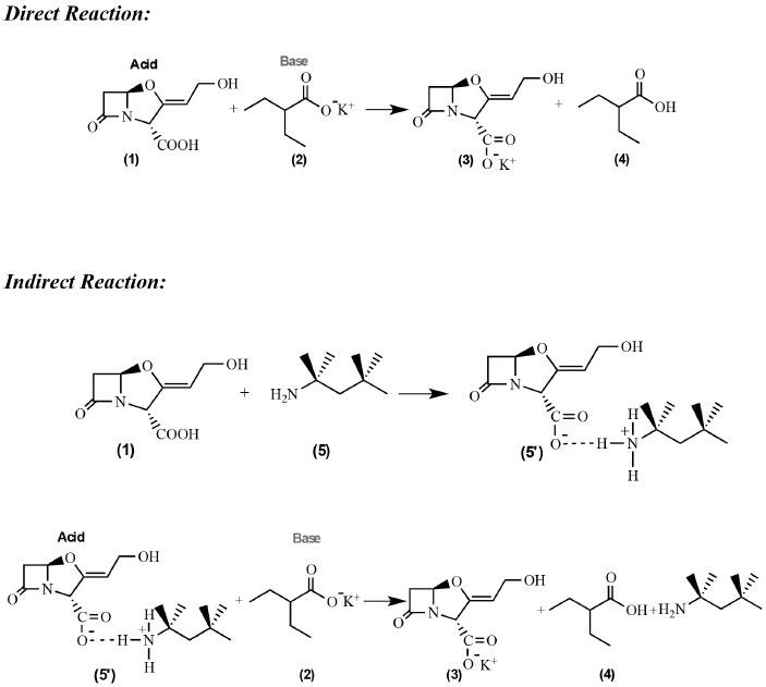 RESULTS AND DISCUSSION Study of the theoretical thermodynamic properties The reactions shown in Figure 1 were considered for this study. In the direct reaction CA (1) reacts with potassium 2-ethylhexanoate (2) to produce potassium clavulanate (3) and 2-ethylhexanoic acid (4), this is a typical acid-base reaction, where CA is an acid and 2-ethylhexanoate is a base. In the indirect reaction, CA (1) reacts with t-octylamine (5) to produce a stable intermediate (5'), which reacts with potassium 2-ethylhexanoate (2) to produce potassium clavulanate (3), t-octylamine (5) and 2-ethylhexanoic acid (4), this is a typical acid-base reaction as well, where acids and bases are indicated in Figure 1. The results obtained from the frequency calculation for the reagents and the products of both reactions are shown in Table 1.