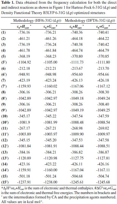 CONCLUSIONS Finally, it is possible to say that the quantum reactive indexes show direct correlation with the higher spontaneity of the indirect reaction for HF and DFT methods. From the quantum reactive indexes values (χ, η, ω, εHOMO and µ), it is possible to say that one characteristic is necessary to have a higher percentage yield: more acid character of the compounds formed by CA and the precipitation agents (when compared to CA). As very consistent results have been obtained in this work for the main and also for other precipitation agents, in the future these theoretical properties could be useful to evaluate new precipitation agents. This would economize time and, most important, reagents and equipment, improving the industrial process.