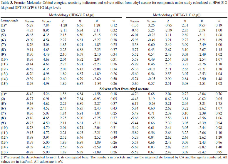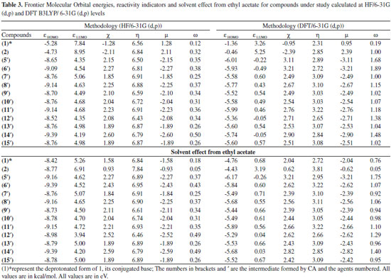 Quantum properties studied and solvent effect With the intention of verifying if the reactive indexes correlate with the theoretical thermodynamic results, the aforementioned reactivity parameters were calculated for Hartree-Fock 6-31G (d,p) and Density Functional Theory B3LYP 6-31G (d,p) optimized structures. The energies of the frontier orbitals, εLUMO and εHOMO, and the reactivity indexes χ, η, µ and ω calculated with and without solvent effect are given in Table 3.
