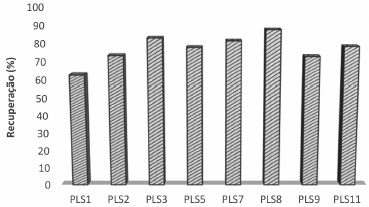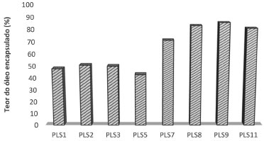 Os CT com polímero e com tensoativo apresentaram maior eficiência de encapsulaçao do óleo essencial que os CB e CQ tanto na proporçao de 1:10 quanto na proporçao de 2:10, mostrando que o uso de adjuvante com a β-CD aumenta a eficiência de encapsulaçao em sistemas contendo β-ciclodextrina (Figura 7). Para as amostras com teor de óleo para β-CD de 1:10, os CQ encapsularam 10% mais OE que os CB, conforme mostrado na Figura 7. Isto indica que com o uso dos dois adjuvantes (polímero e tensoativo), também ocorre um aumento na capacidade de encapsulaçao dos complexos ainda que menor que os CT, tanto com polímero quanto com tensoativo. Loftsson et al.25 analisaram CT contendo PVP e HPMC como adjuvantes em complexos de inclusao contendo β-CD e diferentes fármacos (acetazolamida, metazolamida e econazol) e observou que em todos os casos, o uso dos adjuvantes melhorou consideravelmente a incorporaçao da droga no complexo de inclusao. Fernandes3 avaliou a microencapsulaçao de OE de Lippia sidoides em complexos de inclusao com β-CD por spray drying, em variadas condiçoes experimentais. A eficiência de encapsulaçao ficou em torno de 65%, quando foi utilizada uma razao OE:β-CD de 1:10. Os resultados obtidos com o uso do processador ultrassônico (método empregado neste trabalho), na mesma concentraçao (1:10), observou-se EE de 71,4%, em torno de 5% superior ao reportada por Fernandes.3 Paula e colaboradores26 avaliaram a obtençao de nanopartículas contendo óleo essencial de L. sidoides (Ls) utilizando como carreadores de encapsulaçao a goma angico (AG) e a quitosana (CH). Os autores avaliaram as proporçoes 1:10 e 1:20 (Ls:AG-CH) e constataram que o aumento na proporçao de carreadores nao alterou significativamente a eficiência de encapsulaçao que foi de 77,8% (1:10) e de 69,3% (1:20). Recuperaçao do produto (REC) A recuperaçao do produto foi expressa em porcentagem da massa recuperada pela massa alimentada ao secador (base seca). As amostras PLS7 a PLS11 (1:10) apresentaram média de recuperaçao maior que as amostras PL1 á PLS5 (2:10), 80,2 e 74,3% respectivamente. Os CT contendo polímero apresentaram uma porcentagem de recuperaçao maior quando comparado aos CB e CQ, independente do teor de OE (Figura 8).