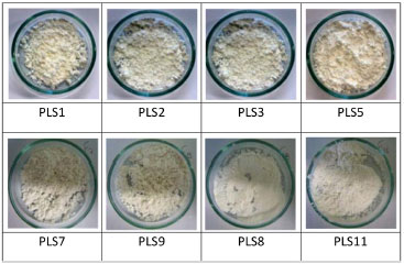 Os valores de recuperaçao de secagem deste trabalho (entre 62,7% e 87,8%), foram superiores aos reportados por Adamiec et al.,27 que obtiveram na melhor condiçao o valor de 70,6%, sendo o menor valor obtido foi 29,1%. Os valores de recuperaçao obtidos foram em média 77%, resultado um pouco superior aos valores frequentemente encontrado na literatura. Souza14 obteve valores de recuperaçao de secagem da ordem de 64% durante a obtençao de extratos secos de Bauhinia forficata, enquanto que Costa-Silva28 obteve recuperaçao média de 65% durante a secagem da enzima lipase por spray drying. A adiçao dos adjuvantes nos CT e CQ, melhorou de 10 a 20% a recuperaçao de secagem, respectivamente nas amostras 1:10 e 2:10. Paula e colaboradores26 obtiveram porcentagens de recuperaçao em torno de 30 a 60% para nanoparticulas de quitosana e goma angico contendo óleo essencial de L. sidoides secas por spray drying. Aparência das partículas obtidas por spray drying Foram obtidas fotografias dos pós após o processo de secagem, visando registrar as características visuais dos sistemas particulados formados. A aparência macroscópica dos pós obtidos pelos CB, CT e CQ foram similares, independente da proporçao de OE como pode-se observar na Figura 9. Porém, apesar do aspecto visual semelhante, os produtos contendo maior proporçao de OE apresentaram aspecto sensorial oleoso, o que pode indicar presença de OE na superfície da partícula.
