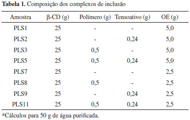 MATERIAIS E MÉTODOS Materiais Matéria prima vegetal: Oleo essencial de Lippia sidoides obtido por destilaçao por arraste a vapor a partir das folhas secas e moídas, adquiridos da PRONAT Produtos Naturais Ltda, Fortaleza, Ceará. Material de parede: Cawamax® W7 (β-ciclodextrina) - Wacker Chemie. Adjuvantes: Kollidon® VA 64 fine (Copolímero de 1-vinil-2-pirrolidona e vinil acetato) - BASF; Tween®80 (polissorbato 80) - LabSynth. Secador: As amostras foram submetidas à secagem em um spray dryer de bancada modelo SD-05 (Lab-Plant, Huddersfield, UK), operando em regime concorrente. Obtençao dos complexos de inclusao Preparaçao dos complexos de inclusao Foram preparados complexos de inclusao binários (CB), ternários (CT) e quaternários (CQ), nas proporçoes de óleo essencial (OE):β-ciclodextrina (β-CD) 2:10 e 1:10 (p/p). Para os CB adicionou-se β-CD em 50 mL de água. Para os CT adicionou-se à mistura inicial o polímero (Kollidon® VA 64 fine) ou o tensoativo (Tween®80) e para os CQ adicionou-se polímero e tensoativo (Tabela 1). As formulaçoes foram homogeneizadas em processador ultrassônico (Sonics VC750) usando sonda de 13 mm em potência de 90% por 20 minutos e em seguida foram mantidas em agitador orbital por 8 horas para hidrataçao dos materiais de complexaçao. Após, adicionou-se OE de Lippia sidoides homogeneizando em processador ultrassônico por 5 minutos em potência de 90% (sonda de 13 mm), formando uma emulsao que permaneceu em repouso over night para que ocorresse a complexaçao do OE na cavidade da β-CD.