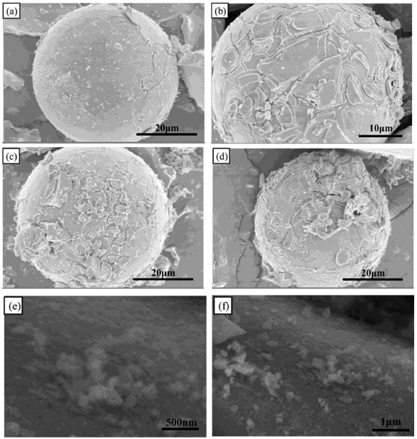 Figure 2. SEM images of Cr/S/TiO2-HGM with different loading replicates: (a) 1 time, (b, e, f) 2 times, (c) 3 times, and (d) 4 times