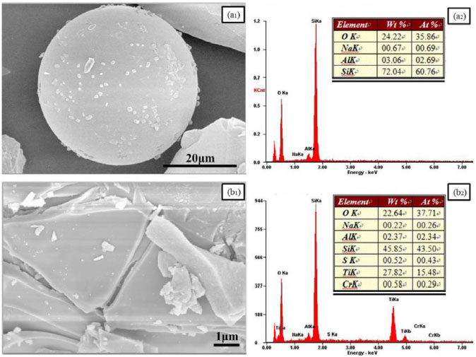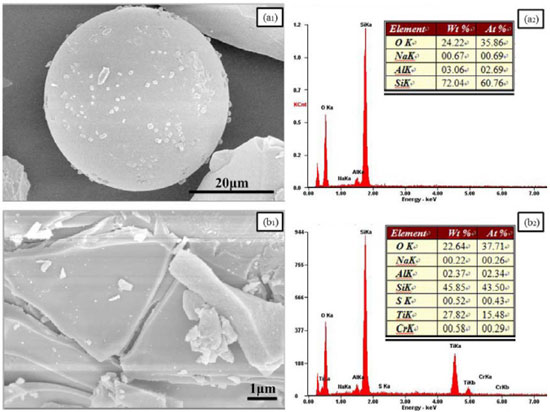 EDX analysis The elemental composition of the samples was estimated by EDX. The SEM and EDX analyses of HGM before and after the loading are shown in Figure 3. Figure 3 (a2) shows that the HGM are mainly composed of Si and O. The HGM data after loading are shown in Figure 3 (b2) - this confirms the presence of Ti, Cr, S, Si, and O. The spectra indicate that the main components are Ti and O with low contents of Cr and S. The XRD and EDX data show that the HGM surface is loaded with Cr/S/TiO2.