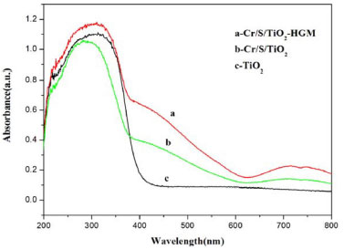 UV-Vis DRS analysis The light absorption characteristics of TiO2 usually change after doping with nonmetal doping20-22 and metal/nonmetal co-doping.23-25 Figure 4 presents the UV-Vis diffuse reflection absorption spectra of TiO2, Cr/S/TiO2, and Cr/S/TiO2-HGM. The absorption wavelength of pure TiO2 is less than 400 nm, and bulk TiO2 is a wide band gap semiconductor with a band gap of 3.2 eV (387 nm) for anatase.26 The absorption spectra of the Cr/S/TiO2 and Cr/S/TiO2-HGM samples obviously extend deeper into the visible light region relative to TiO2. Interestingly, the Cr/S/TiO2 shows significant absorption from 400 to 800 nm. The absorption of light increases dramatically in the visible region10 after S and Cr co-doping. There is an absorption peak of Cr/S/TiO2 and Cr/S/TiO2-HGM around 400-450 nm corresponding to Cr.27 The absorption at 450 nm is assigned to the electron transition in the energy level of doping Cr3+. This transfers into the conduction band (Cr3+→Ti4+) of TiO2.10 Additional absorption is due to the Cr3+ ion itself (4A2g→4T1g).28-30 There is a wide absorption band in the 620-800 nm range that can be attributed to the d-d transitions (4A2g→4T2g) of Cr3+.12 The Cr/S/TiO2-HGM shows a broader absorption ranging from UV light to visible light (200-800 nm). Thus, the Cr/S/TiO2 loaded on hollow glass microspheres enhances catalyst light absorption.