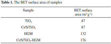 BET measurements The BET surface area obtained from the N2 adsorption-desorption isotherms are listed in Table 1. The BET surface area of the Cr/S/TiO2 is higher than the TiO2. The BET surface area increased to 176 m2 g-1 after loading. The Cr/S/TiO2-HGM sample has a high surface area, and this could enhance the visible absorption and thus photocatalytic activity.