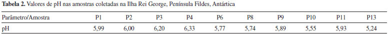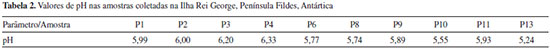 RESULTADOS E DISCUSSAO Caracterizaçao do solo A concentraçao dos elementos traço em sedimento e solo podem estar relacionados a parâmetros físico-químicos, uma vez que a disponibilidade desses elementos para o meio ambiente depende de fatores tais como o pH que afetam a distribuiçao, mobilidade e disponibilidade dos elementos. Na Tabela 2 estao dispostos os valores de pH nas amostras de solo coletada na Ilha Rei George, Península Fildes, Antártica.
