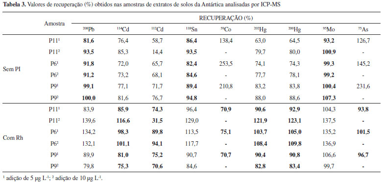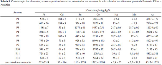 Como já apresentado na Tabela 3, os valores de recuperaçao obtidos foram satisfatórios (75 a 120%),24 indicando uma boa exatidao do método para a determinaçao de Pb, Cd, Sn, Hg, Mo e As. Apenas para o Co, utilizando Rh como PI, os valores de recuperaçao apresentaram-se um pouco abaixo da faixa adequada. Determinaçao e avaliaçao das concentraçoes de Pb, Cd, Sn, Co, Hg, Mo e As nas amostras de solo da Antártica Os extratos das amostras de solo, obtidos utilizando o procedimento de extraçao (ASTM D3974-09) em triplicata, foram analisados por ICP-MS com as condiçoes otimizadas anteriormente. A média dos resultados de concentraçao encontrados nas replicatas para cada elemento nas amostras coletadas nos diferentes pontos da Península Fildes - Antártica estao dispostos na Tabela 5. Observou-se que nao há uma distribuiçao homogênea dos elementos por toda a extensao da Península Fildes.