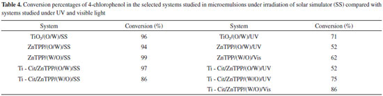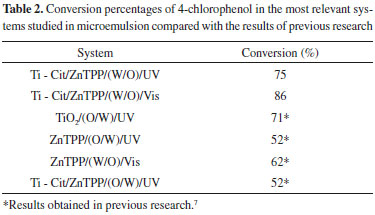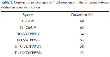 RESULTS AND DISCUSSION Aqueous solution Table 1 shows the percentage of conversion of 4-CP in aqueous solution under the action of the titanium citrate in solution or titanium dioxide in suspension. In addition, we studied the influence of the ZnTPP adsorbed onto each one of the components mentioned above. The final suspensions were subsequently irradiated using UV and visible solar light, respectively.