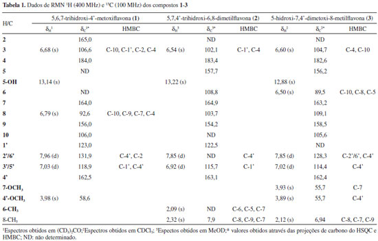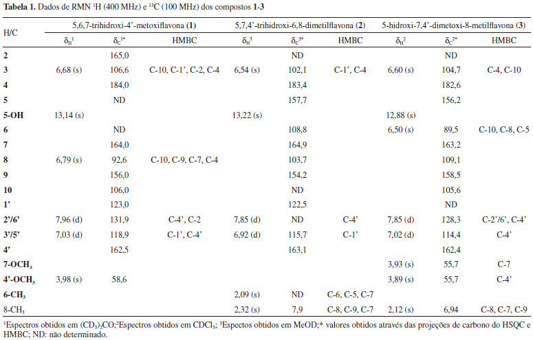 As substâncias 1-3 foram isoladas das frações acetato de etila [MFFE-AA3, 1; MFFE-AA3.8, 2], diclorometânica [MFFE-D5.3, 1; MFFE-D5.7, 2], e hexânica [MFFE-HD7, 3], todas da partição do extrato etanólico das folhas de M. ferruginata. Nos espectros de RMN de 1H de 1-3 foram observadas as presenças de dois dubletos, em um sistema AA'BB' de acoplamento de spin, na região de hidrogênios ligados a carbonos aromáticos em δH 7,03 e 7,96 (1), 6,92 e 7,85 (2) e 7,02 e 7,85 (3), integrados para dois hidrogênios cada, com constante de acoplamento de 8,4 Hz, atribuídos à H-3'/5' e H-2'/6', respectivamente, caracterizando o anel B de flavona para estes compostos. Nestes mesmos experimentos foram observados também: para 1 três singletos em δH 6,79 (H-8), 6,68 (H-3) e 3,98 (OCH3-4'), integrando respectivamente para um, um e três hidrogênios, sendo o último sinal referente aos hidrogênios metílicos ligados a um heteroátomo; um singleto em δH 13,14, característico de flavonoides contendo um grupo hidroxila na posição C-5, sugerindo ser uma flavona contendo um substituinte na posição C-4' e o anel A tri-substituído;28 para 2 observou-se um singleto em δH 6,54 (H-3) integrando para um hidrogênio e dois singletos intensos de hidrogênios metílicos em δH 2,32 (CH3-8) e δH 2,09 (CH3-6) integrando para três hidrogênios cada; estas observações sugeriram a presença de uma flavona contendo um substituinte na posição C-4' e um anel A completamente substituído. Para 3 foram observados dois singletos em δH 6,60 (H-3) e 6,50 (H-6) integrados para um hidrogênio cada e dois singletos em δH 3,93 (7-OCH3) e 3,89 (4'-OCH3) referentes aos hidrogênios metílicos das metoxilas aromáticas e um singleto intenso de hidrogênio metílico em δH 2,12 (8-CH3), integrando para três hidrogênios e um singleto em δH 12,88 (5-OH), característico de flavonoides contendo um grupo hidroxila na posição C-5. Nos mapas de contornos de HSQC pôde-se observar que os singletos em δH 6,68 (1), 6,54 (2) e 6,60 (3) apresentavam correlações com os sinais de carbonos em δC 106,6 (1), 102,1 (2) e 104,7 (3) característicos dos hidrogênios H-3 ligados aos C-3 de uma flavona. Nos experimentos de HMBC observou-se as correlações destes singletos com os carbonos em δC 106,0; 123,0; 165,0 e 184,0 atribuídos aos carbonos C-10, C-1', C-2 e C-4 para 1; δC 122,5 e 183,4 atribuídos aos carbonos C-1' e C-4 para 2 e δC 105,6 e 182,6 atribuídos aos carbonos C-10 e C-4 para 3, respectivamente. No mapa de contorno de HMBC de 1, as correlações dos singletos em δH 6,79 (H-8) com os sinais de carbonos em δC 106,0; 156,0; 164,0 e 184,0 atribuídos aos carbonos C-10, C-9, C-7 e C-4 para 1, sugeriram a ligação deste hidrogênio ao carbono C-8. Os dubletos em δH 7,03 (1), 6,92 (2) e 7,02 (3) (H-3'/5') mostraram correlações com os sinais de carbonos em δC 118,9; 115,7 e 114,4, respectivamente, referentes aos carbonos C-3'/5', enquanto nos experimentos de HMBC foram observadas as correlações destes hidrogênios com os carbonos em δC 123,0 e 162,5 (1), 122,5 e 163,1 (2) e 162,4 (3), respectivamente, referentes aos carbonos C-1' e C-4'. Nos experimentos de HSQC observou-se as correlações dos dubletos em δH 7,96 (1) e 7,85 (3) (H-2'/6') com os sinais de carbonos em δC 131,9 (1), 128,3 (3), referentes aos carbonos C-2'/6'. Nos experimentos de HMBC pôde-se observar as correlações destes hidrogênios (H-2'/6') com os sinais de carbono em δC 162,5 (C-4') e δC 165,0 (C-2) para 1, 163,1 (C-4') para 2 e 162,4 (C-4') para 3. O hidrogênio metílico em δH 2,32 (8-CH3) de 2 mostrou correlação, no experimento de HSQC, com o sinal de carbono em δC 7,9, correspondente ao carbono da metila ligada ao C-8. No mapa de contorno HMBC este hidrogênio correlacionou-se com os sinais de carbono em δC 103,7; δC 154,2 e δC 164,9; referentes aos carbonos C-8, C-9 e C-7, respectivamente. O segundo sinal de hidrogênio metílico de 2, com deslocamento δH 2,09 (6-CH3) mostrou correlação com sinais de carbono em δC 108,8, δC 157,7 e δC 164,9, referentes aos carbonos C-6, C-5 e C-7, respectivamente, o que confirmou a ligação desta metila ao carbono C-6. A presença de uma hidroxila (δH 13,22) em C-5 em 2 foi confirmada com a obtenção do espectro em acetona deuterada, análise dos dados e comparação permitiram identificá-la como a flavona 5,7,4'-trihidroxi-6,8-dimetilflavona (2).26 Nos mapas de contornos de HSQC pôde-se observar que os singletos em δH 3,98 (4'-OCH3) para 1, δH 3,93 (7-OCH3) e 3,89 (4'-OCH3) para 3 correlacionam com os sinais de carbonos em δC 58,6 (1) e 55,7 (3) e para 3 um único sinal para 2 carbonos indicou que as metoxilas não estavam orto dissubstituídas. Nos experimentos de HMBC os singletos das metoxilas em δH 3,98 (1), 3,89 e 3,93(3) mostraram correlações com os sinais de carbonos em 162,5 e 162,4, atribuídos aos carbonos C-4' e δC 163,2 atribuído a carbono C-7. No HSQC de 3 o sinal do hidrogênio metílico (8-CH3) em δH 2,12 apresentou correlação com um sinal de carbono em δC 6,9, referente ao carbono CH3-8. No mapa de contorno de HMBC foi possível observar, além das correlações com os carbonos C-8 (δC 109,1) e C-7 (δC 163,2), correlação com um sinal de carbono em δC 158,5 atribuído ao carbono C-9, confirmando a ligação da metila ao C-8. A ocorrência natural da 5-hidroxi-7,4'-dimetoxi-8-metilflavona (3) foi proposta pela primeira vez em um trabalho com as folhas de Eucalyptus camaldulensis.27 A C-alquilação dos flavonoides pode acontecer de duas formas distintas; a primeira se dá através da ligação de um açúcar diretamente ao núcleo flavonoídico, enquanto a segunda envolve a ligação de diferentes grupos alquila, geralmente do grupo metila, a um dos carbonos do flavonoide. Os primeiros trabalhos envolvendo o isolamento de flavonoides C-metilados se referem a espécies de Pinus (Pinaceae) e à Lonchitis tisserantii,31 nas quais se enc