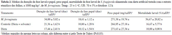 Para o tratamento em que as lagartas foram alimentadas com o extrato etanólico das folhas de M. ferruginata na concentração de 1000 mg mL-1 foi observado uma mortalidade larval de 56,67% quando comparado ao controle. A redução do crescimento aliada à mortalidade faz com que a lagarta apresente um alto gasto energético para quebrar substâncias tóxicas presentes em seu organismo ao invés de ter esse custo energético direcionado para o crescimento e pupação. Seu potencial tem efeitos principalmente sobre a duração e mortalidade da fase larval.42 Os resultados apresentados para M. ferruginata sugerem eficiência deste extrato como inseticida, pois ocasiona efeito na lagarta logo nas primeiras fases de desenvolvimento, o que poderia reduzir os prejuízos na produção agrícola. Os resultados obtidos sugerem que novos trabalhos com outras partes vegetais e substâncias isoladas para que se possa conhecer melhor a sua eficácia.