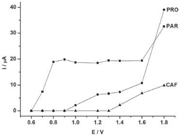 RESULTADOS E DISCUSSÃO Um trabalho publicado recentemente contém algumas informações importantes sobre os três compostos em estudo no presente trabalho (PAR, PRO e CAF).21 As três moléculas, presentes na mesma amostra farmacêutica, apresentam potenciais de oxidação relativamente constantes e separados (+0,80 V, +1,30 V e +1,55 V para PAR, PRO e CAF, respectivamente) usando H2SO4 0,1 mol L-1 como eletrólito suporte e BDD como eletrodo de trabalho. Estes estudos foram realizados por voltametria cíclica (sistema estacionário). Com o intuito de obter um método analítico mais rápido, preciso e sensível, o comportamento eletroquímico dos três compostos foi verificado empregando o sistema BIA-MPA. Neste estudo, 10 pulsos de potenciais foram aplicados ao eletrodo de BDD (+0,60, +0,70, +0,80, +0,90, +1,00, +1,20, +1,30, +1,40, +1,60 e +1,80 V; 70 ms cada) repetidamente em função do tempo e 10 amperogramas distintos foram registrados no mesmo experimento. Soluções contendo 10 mg L-1 de CAF, 30 mg L-1 de PRO ou 50 mg L-1 de PAR foram injetadas sequencialmente e a partir dos valores de corrente detectados em cada pulso de potencial (amperogramas), os voltamogramas hidrodinâmicos mostrados na Figura 1 foram construídos.