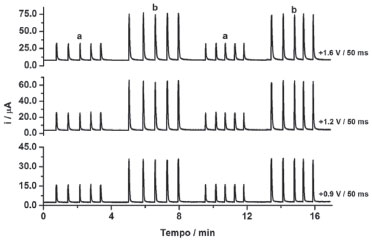 ![]() Figura 3. Estudo de repetibilidade. Amperogramas obtidos em três pulsos de potenciais distintos para injeções sucessivas de soluções contendo: (a) PAR + PRO + CAF (20 mg L-1 + 12 mg L-1 + 4 mg L-1) e (b) PAR + PRO + CAF (60 mg L-1 + 36 mg L-1 + 12 mg L-1). Volume de injeção: 150 µL; velocidade de injeção: 100 µL s-1; velocidade de agitação: 1400 rpm
