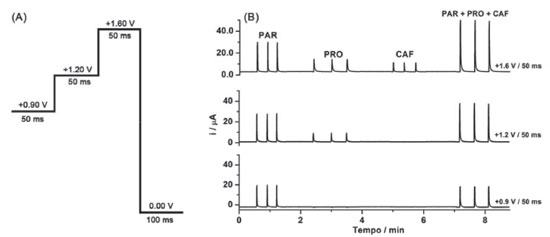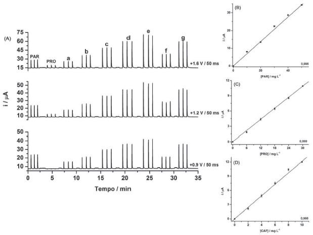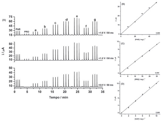 A partir dos voltamogramas hidrodinâmicos apresentados na Figura 1, pode-se observar que a partir do potencial de +0,6 V ocorre a oxidação do PAR, onde ocorre a transferência de dois prótons e dois elétrons.40,41 A oxidação da PRO se inicia próximo ao potencial de +1,0 V com a transferência de um elétron e sem a transferência de prótons.21 A oxidação da CAF se inicia em potenciais próximos a +1,3 V com a transferência de 4 prótons e 4 elétrons.5,9,42 Os voltamogramas hidrodinâmicos apresentados na Figura 1 também mostram que entre os potenciais de +0,60 V e +0,90 V ocorre a oxidação do PAR sem a interferência da PRO e CAF. Entre +0,9 V e +1,3 V ocorrem a oxidação do PAR e PRO sem a interferência da CAF em potenciais acima de +1,3 V, os três compostos são oxidados. A partir destas informações, um esquema de aplicação de pulsos de potenciais foi proposto e otimizado (+0,9 V/ 50 ms; +1,2 V/ 50 ms e +1,6V/ 50 ms e 0,0 V/ 100 ms) com o intuito de determinação simultânea dos três compostos por BIA-MPA (Figura 2A). Na Figura 2B são mostrados os amperogramas obtidos na injeção em triplicata de soluções contendo: (i) somente PAR 30 mg L-1; (ii) somente PRO 18 mg L-1; (iii) somente CAF 6 mg L-1; (iv) solução contendo PAR + PRO + CAF (30 + 18 + 6 mg L-1, respectivamente). Os valores de concentração das soluções de PAR, PRO e CAF foram selecionados em função dos valores de concentração destes compostos tipicamente encontrados em amostras farmacêuticas (250 mg de PAR, 150 mg de PRO e 50 mg de CAF).