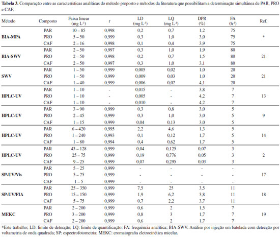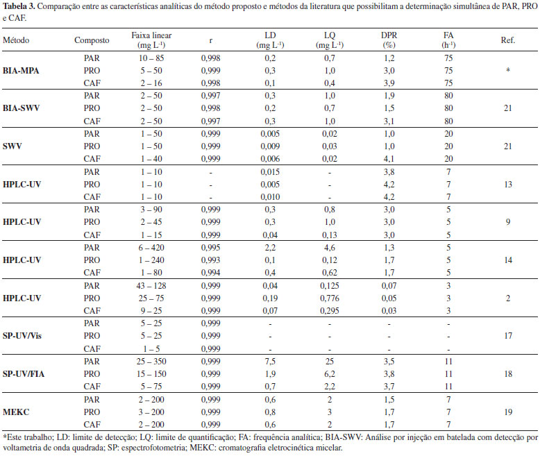 O teste t de Student para amostras pareadas foi usado para comparar os valores obtidos por HPLC com os obtidos por BIA-MPA. A partir dos resultados apresentados na Tabela 2 pode-se afirmar que os resultados obtidos pelo método proposto foram similares aos obtidos por HPLC a um nível de confiança de 95%, onde os valores de t calculados foram menores que o valor crítico teórico (2,78, n = 3). Os resultados obtidos com o método BIA-MPA também foram comparados aos obtidos com outros métodos da literatura2,9,13,14,17-19,21 que também possibilitam a determinação simultânea de PAR, PRO e CAF (Tabela 3). Como pode ser observado, alguns trabalhos publicados anteriormente apresentam limites de detecção mais baixos, porém, para a determinação de princípios ativos em formulações farmacêuticas, baixos limites de detecção geralmente não são necessários. Como vantagens do método aqui proposto podem ser citados a frequência analítica muito superior, preparo de amostras simplificado (simples pulverização, dissolução e diluição) e geração mínima de resíduos por análise (método analítico verde).