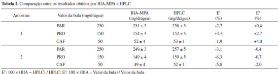 O desempenho do sistema BIA-MPA foi verificado na análise de duas amostras farmacêuticas contendo simultaneamente PAR, PRO e CAF e os resultados obtidos foram comparados com os obtidos por HPLC. A Tabela 2 mostra os resultados obtidos na análise das amostras por ambos os métodos.