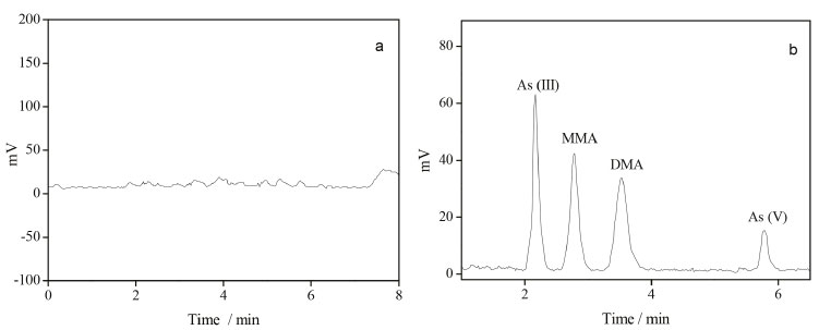 ![]() Figure 2. HPLC-HG-AFS chromatograms of (A) blank sample, (B) spiked sample with the four arsenic species (KH2PO4-NaH2PO4 mobile phase, isocratic elution, pH=6, injection volume 150 µL, fiow rate 1.0 mL min-1)