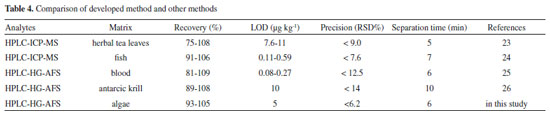 Comparison of the proposed method with others Listed in Table 4 are the experimental results of HPLC-ICP-MS,23,24 HPLC-HG-AFS,25,26 and the proposed method. In comparison with those reported methods for the separation and determination of arsenic species, the proposed method has some advantages in higher precision, more accuracy, and shorter separation time.