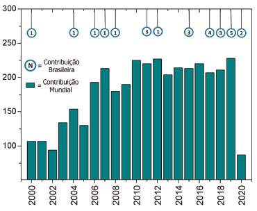 ![]() Figura 2. Número de artigos publicados durante janeiro de 2000 - junho de 2020 incluindo o termo "rotaxane*"; na parte superior do gráfico, os círculos indicam a contribuição brasileira em cada ano