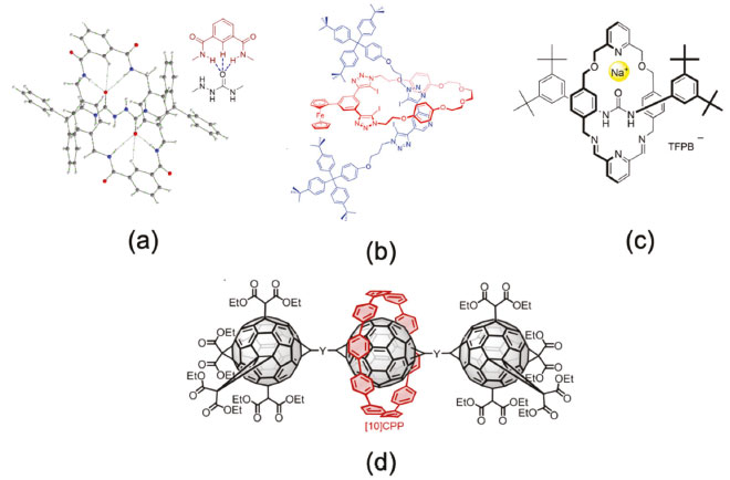 ![]() Figura 4. Representação das interações presentes entre os componentes dos rotaxanos mais recorrentes na literatura. (a) Ligações de hidrogênio [reproduzido e adaptado com a permissão de Salbego & Martins et al., Eur. J. Org. Chem. 2019, 3464-3471. Copyright (2019) Wiley Online Library]; (b) modelo com metal-ativo [reproduzido com a permissão de Lim & Beer, Eur. J. Org. Chem. 2019, 3433-3441. Copyright (2019) Wiley Online Library]; (c) modelo contendo íon [reproduzido e adaptado com a permissão de Chiu, Chem. Eur. J. 2014, 20, 4563-4567. Copyright (2014) Wiley Online Library]; (d) empilhamento π∙∙∙π [reproduzido com a permissão de Guldi & Delius et al., J. Am. Chem. Soc. 2018, 140, 41, 13413-13420. Copyright (2018) American Chemical Society]