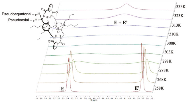 ![]() Figura 6. Representação da co-conformação cadeira adotada por um [2]rotaxano contendo um macrociclo de tetralactama e o fenômeno de coalescência para os hidrogênios E e E', pseudoaxial e pseudoequatorial, respectivamente. Os espectros de RMN de 1H foram obtidos em diferentes temperaturas e estão expandidos na faixa de 3.5 a 6.1 ppm (400 MHz, CDCl3) [reproduzido e adaptado de Rodrigues, L. V.89 CC BY-NC-ND 4.0 License (2013)]