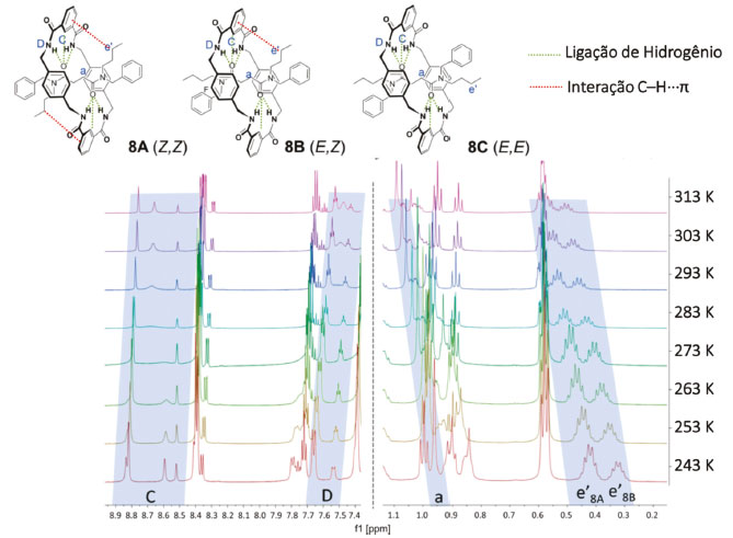 Ao ser verificado apenas um sinal (Figura 6, 313 K, temperatura de coalescência) para esses dois hidrogênios (E e E') é indicativo de um movimento dinâmico rotacional rápido na escala de tempo do RMN. Entretanto, quando resfriada a amostra, pode ser constatada a resolução de dois sinais diferentes, ou seja, é possível verificar os hidrogênios em dois ambientes magneticamente distintos, o que indica que está ocorrendo um movimento mais lento na escala temporal do RMN (Figura 6, 298 K). Assim, é possível acompanhar o movimento de rotação de um rotaxano.23,87,90-92 Nesse sentido, o RMN se tornou o método mais aplicado na observação e monitoramento de movimentos intercomponentes com mudança de conformação, na qual a energia livre de ativação, na temperatura de coalescência, comumente é encontrada na faixa entre 6 à 25 kcal mol-1, para [2]rotaxanos com macrociclos de tetralactama.91 A mudança estrutural no eixo molecular da molécula de rotaxano interfere diretamente na energia livre de ativação18,20,33 e a natureza das interações entre os componentes reflete nos movimentos.66 Estudos que utilizaram uma variação dos grupos volumosos20,32 ou no diâmetro do macrociclo,20,93 demonstraram que as interações entre o macrociclo e os grupos volumosos mudam significativamente a energia de ativação dos movimentos. Nosso grupo de pesquisa demonstrou que inclusive confôrmeros de [2]rotaxanos são influenciados pela mudança estrutural mudando as interações entre os componentes e consequentemente a energia de ativação do movimento.33 Adicionalmente, experimentos com variação de temperatura também são realizados para análise dos tipos de interações envolvidas.18,33 Analisando espectros de uma molécula de [2]rotaxano contendo macrociclo de tetralactama (Figura 7), percebemos mudanças no deslocamento químico de certos hidrogênios (C, D, a, e'8A e e'8B na Figura 7), com experimento de variação da temperatura. As principais interações percebidas em solução são as ligações de hidrogênio entre o macrociclo e a estação, e interações C-H∙∙∙π entre o macrociclo e o grupo volumoso.