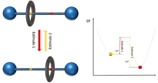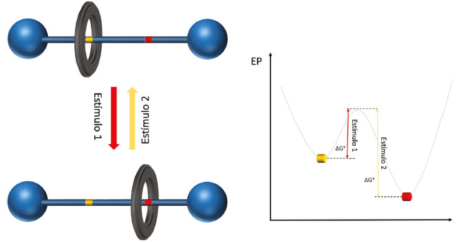 A desblindagem dos hidrogênios C e D é característico de quando o átomo de hidrogênio está participando de uma ligação de hidrogênio (e.g., NH∙∙∙O), isso porque os átomos mais eletronegativos estão atraindo a densidade eletrônica para si, deixando o hidrogênio mais suscetível a sentir o efeito do campo magnético exercido pelo RMN94 (Figura 7). Quando a interação é rompida, com o aumento da temperatura, o hidrogênio volta a ser blindado e, no espectro de RMN, é movido para deslocamentos químicos menores.71 A formação de uma interação C-H∙∙∙π é caracterizada pela blindagem do sinal do hidrogênio que participa desta interação. Isso ocorre devido ao efeito anisotrópico exercido pelos anéis benzílicos presentes no macrociclo, blindando os hidrogênios quando estão espacialmente dentro do cone de blindagem anisotrópico.95 O rompimento da interação C-H∙∙∙π com o aumento de temperatura é caracterizado pela desblindagem dos hidrogênios e'8A e e'8B, como observado na Figura 7. Além do movimento de rotação, experimentos de RMN podem ser utilizados para observar outros movimentos característicos,96 como o de translação, ou seja, a capacidade de locomoção do macrociclo ao longo do eixo molecular. Esse movimento, em particular, foi primeiramente observado por L. Anelli, N. Spencer e J. F. Stoddart em 1991,97 ao utilizarem uma molécula de [2]rotaxano com um eixo molecular contendo duas estações. Os autores puderam rastrear em qual das estações permanecia o macrociclo, por meio de experimentos de RMN de 1H com variação de temperatura.97 Nesse trabalho, os autores declararam, em tradução livre: "Agora existe a oportunidade de explorar o movimento molecular [translacional] inserindo estações diferentes ao longo do eixo molecular [...] de tal maneira que essas diferentes estações possam ser alcançadas seletivamente por meios químicos, eletroquímicos ou fotoquímicos [...]. Na medida em que for possível controlar o movimento de um componente molecular em relação ao outro em um [2]rotaxano, a tecnologia para a construção de "máquinas moleculares" emergirá."97 E, de fato, os primeiros exemplos de rotaxanos que contém mais de uma estação, que respondem a estímulos externos, foram descritos nos anos seguintes.98-100 Para que um rotaxano funcione no transporte molecular é necessário mais de uma estação no eixo molecular, sendo uma de maior afinidade energética (maior estabilidade), em que o macrociclo tende a ficar posicionado e outra de menor afinidade (menor estabilidade).23,96,101,102 Por meio de algum estímulo externo (Estímulo 1, Figura 8), o macrociclo pode mudar de estação e se mover ao longo do eixo molecular, permanecendo posicionado no estado de menor afinidade, mas ainda na menor energia potencial depois do estímulo. O sistema pode ser restaurado ao estado original por meio de outro estímulo (Estímulo 2, Figura 8), e se esse processo puder ser controlado e sistematizado, teremos assim uma máquina molecular.103