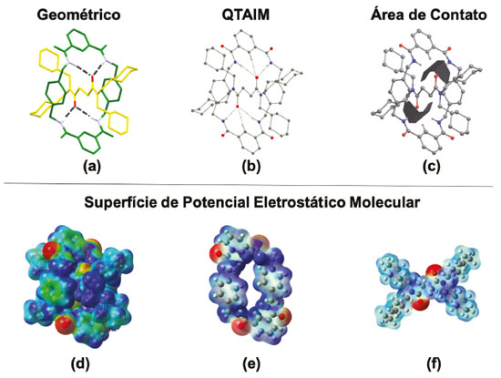 Nas superfícies de MEPs, os átomos de hidrogênio do macrociclo que participam da ligação de hidrogênio, na cor azul (potencial positivo), interagem com o grupo aceptor no eixo molecular, na cor vermelha (potencial negativo). Esta técnica mostra a complementariedade das superfícies, diferenciando-a das outras técnicas que são mais pontuais. Com a MEP pode-se verificar que existe uma superfície que mutualmente se complementa, não cada interação exercendo seu próprio papel sozinha, mas sim todas as interações cooperando para a estabilização entre as moléculas, ou seja, são "paredes" interagindo e não interações isoladas (Figura 9 (d), (e) e (f)). De maneira análoga, Orlando e colaboradores38 investigaram as diferenças entre polimorfos de [2]rotaxanos em termos de interações intercomponentes. Os autores relataram uma diferença de 8,43 kcal mol-1 em energia de estabilização intercomponente entre as duas formas relatadas, mostrando que uma forma é 14% mais estável que a outra, quando são correlacionados dados de energia de estabilização.38 Adicionalmente, os autores utilizaram da QTAIM para obter mais informações sobre as interações intercomponentes.38 Observando que havia uma boa diferença no número total de interações intercomponentes (22 vs. 36) e na contribuição da ligação de hidrogênio trifurcada (41 vs. 60%) em cada polimorfo.38 De maneira geral, foi verificado que no polimorfo que possuía a maior energia de estabilização, a contribuição da ligação trifurcada era menor, pois a energia de estabilização era distribuída em um maior número de interações. Já no polimorfo com menor energia de estabilização, a ligação trifurcada contribuía mais na estabilização, somada a poucas outras interações entre o macrociclo e o eixo molecular.38 Em estudos como esse, é possível observar os efeitos das interações intercomponentes na geometria molecular.