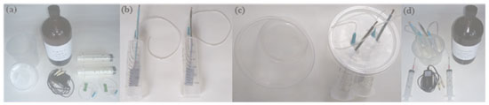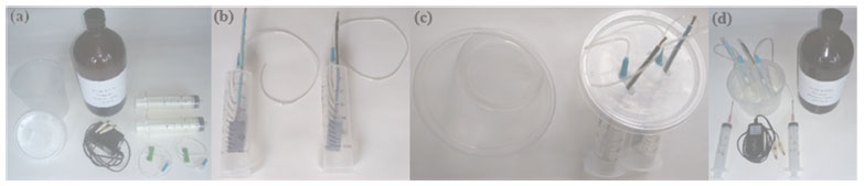 ![]() Figura 1. (a) Materiais utilizados na montagem da célula eletrolítica; (b) eletrodos de aço inoxidável austenítico montados dentro das seringas de 60 mL; (c) detalhe na tampa do pote de plástico para encaixe e estabilidade das seringas na posição vertical; (d) conexões das seringas de 20 mL para o preenchimento total dos eletrodos