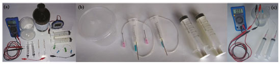 ![]() Figura 2. (a) Materiais utilizados na montagem das células a combustível; (b) eletrodos de platina montados dentro das seringas de 10 mL; (c) conexões das seringas de 20 mL para o preenchimento total dos eletrodos