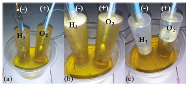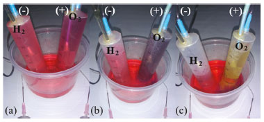 ![]() Figura 3. Eletrólise da água utilizando como solução eletrolítica a mistura de H2SO4 0,5 mol L-1 com extrato de feijão preto. (a) Início da eletrólise; (b) após 1 minuto de eletrólise; (c) após 5 minutos de eletrólise