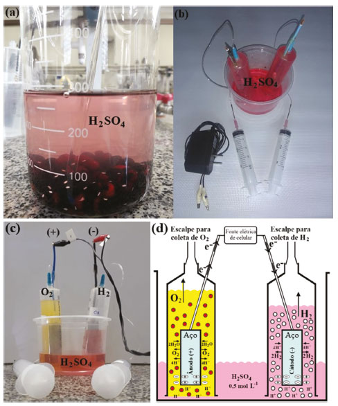 ![]() Figura 4. (a) Mistura da solução eletrolítica de H2SO4 0,5 mol L-1 com feijão preto para extração das antocianinas; (b) preenchimento das seringas com a mistura de H2SO4 0,5 mol L-1 com extrato de feijão preto; (c) eletrólise da água e desprendimento de H2 no cátodo (-) e de O2 no ânodo (+); (d) esquema detalhando as espécies envolvidas na eletrólise da água em solução ácida, H2SO4 0,5 mol L-1