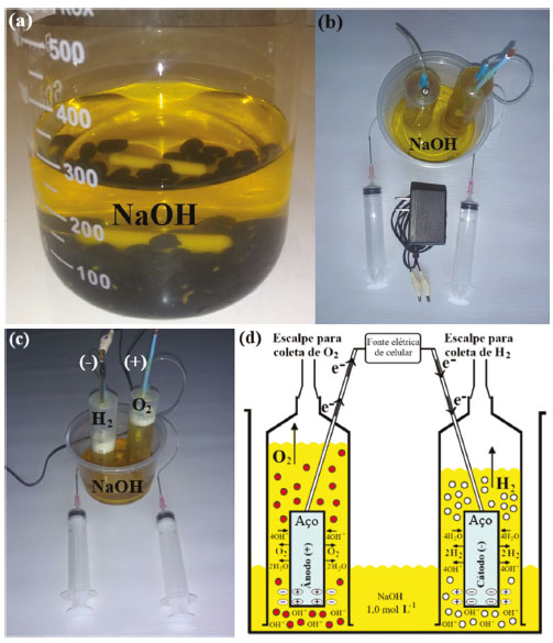 ![]() Figura 6. (a) Mistura da solução eletrolítica de NaOH 1,0 mol L-1 com feijão preto para extração das antocianinas; (b) preenchimento das seringas com a mistura de NaOH 1,0 mol L-1 com extrato de feijão preto; (c) eletrólise da água e desprendimento de H2 no cátodo (-) e de O2 no ânodo (+); (d) esquema detalhando as espécies envolvidas na eletrólise da água em solução básica, NaOH 1,0 mol L-1