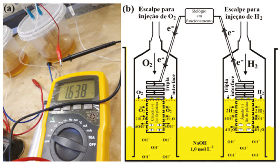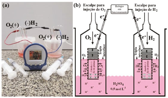 ![]() Figura 8. (a) Células a combustível associadas em série e funcionamento do relógio digital; (b) esquema simplificado do funcionamento da célula a combustível em solução ácida, H2SO4 0,5 mol L-1