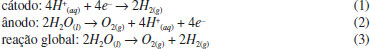 Produção dos gases hidrogênio e oxigênio em solução ácida Considerando-se a produção dos gases hidrogênio e oxigênio numa célula eletrolítica, o processo ocorre por meio da transformação de energia elétrica em energia química, e os gases assim produzidos possuem alto grau de pureza. Utilizou-se o extrato de feijão preto para destacar a solução eletrolítica ácida e melhorar a visibilidade das semirreações de desprendimento dos gases hidrogênio e oxigênio, Figuras 4(a), 4(b) e 4(c). A Figura 4(d) apresenta o detalhamento da eletrólise da água na célula eletrolítica contendo a mistura de H2SO4 0,5 mol L-1 com extrato de feijão preto, o que facilita o entendimento das semirreações eletroquímicas de produção dos gases hidrogênio e oxigênio. Manteve-se o sistema aberto e observou-se que o volume do gás hidrogênio é o dobro do volume do gás oxigênio, concordando com a estequiometria da reação para a formação da água.