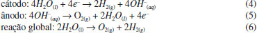 Produção dos gases hidrogênio e oxigênio em solução básica O indicador alternativo de pH foi usado para melhorar a visibilidade das semirreações de desprendimento dos gases hidrogênio e oxigênio e para facilitar a leitura dos volumes dos gases, Figuras 6(a), 6(b) e 6(c). A Figura 6(d) apresenta o esquema da eletrólise da água na célula eletrolítica contendo a mistura NaOH 1,0 mol L-1 com extrato de feijão preto, o que facilita o entendimento das semirreações eletroquímicas de produção dos gases hidrogênio e oxigênio. Novamente o sistema foi mantido aberto e o volume do gás hidrogênio produzido foi o dobro do volume do gás oxigênio, em concordância com a estequiometria da reação para formação da água.