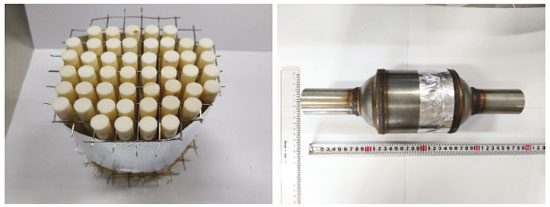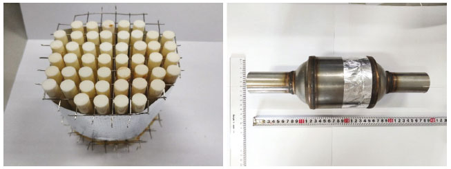 X-ray diffraction (XRD) patterns were collected using a Rigaku DX-2500 diffractometer with Cu Kα radiation (0.15406 nm) in the range of 10°-90° with a step size of 0.02°. Fourier transform infrared spectrometer (FT-IR) patterns were measured employing a Vertex 70 Fourier infrared spectrometer. The BET specific surface area (Brunauer Emmett Teller, BET) for determining the specific surface area, catalyst pore volume, catalyst pore size and distribution of the catalyst were tested employing ASAP 2020 specific surface area and mesoporous / microporous analyzer. Scanning Electron Microscope (SEM) images were observed applying a Hitachi HITA CHI S-3400N scanning electron microscope. H2 temperature-programmed reduction (H2-TPR) studies were carried out using a Chem-Star program temperature reduction instrument to observe the reduction characteristics of the catalysts. Prior to the experiment, the sample was pretreated in N2 (25 mL min-1) at 450 °C for 1 h. The catalytic activity of Pt-Rh-Pd / CeO2-ZrO2-La2O3-Al2O3 fibrous catalyst was evaluated in a Dong feng LZ6430BQBE car with a self-assembled catalytic device. As displayed in Figure 2, Pt-Rh-Pd / CeO2-ZrO2-La2O3-Al2O3 fibrous catalyst was wrapped on the surface of ceramic rods and fixed in the self-assembled catalytic device with metal mashes. The smoke and dust samplers were used to collect automobile exhaust. Both a portable infrared CO analyzer and a gas chromatography mass spectrometer were used to detect the components and contents of the exhaust. The catalytic conversion efficiency was calculated by the following formula in which A represented contaminant content before catalyst installation and B represent contaminant content after catalyst installation. ![]()