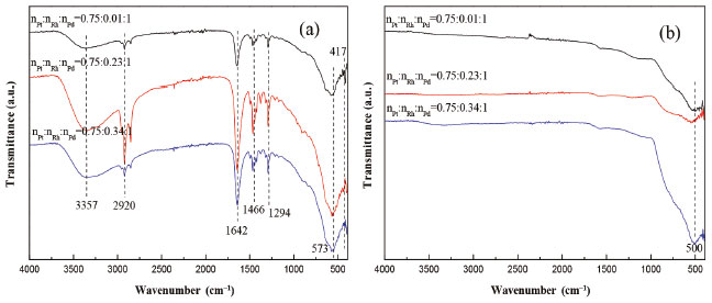 Figure 4 shows the FT-IR spectra of Pt-Rh-Pd / CeO2-ZrO2-La2O3-Al2O3 fibrous catalyst after pre-oxidation at 80 °C (a) and carbonization at 1100 °C (b). As shown in Figure 4(a), typical absorption peaks that appear at 2920 cm-1 and 1466 cm-1 are mainly caused by the stretching vibration and bending vibration of the C-H bond in PVP. The absorption peak at 3357 cm-1 is attributed to H-OH stretching in PVP. The absorption peak at 1642 cm-1 is attributed to the C=C stretching vibration in PVP. The absorption peak at 1294 cm-1 is generated by the C-O stretching vibration in C6H14O. From Figure 4(b), it is found that when the catalysts experienced carbonizing at 1100 °C for 1 h, all of the absorption peaks presented above finally disappeared, mainly in respect that PVP and the solvent (C2H5OH, DMF) in the catalysts are thermally decomposed and volatilized during the heating process. It proves that Pt-Rh-Pd / CeO2-ZrO2-La2O3-Al2O3 fibrous catalyst is decomposed to generate stable carbon fiber structure and metal oxide structure after pre-oxidation and carbonization.