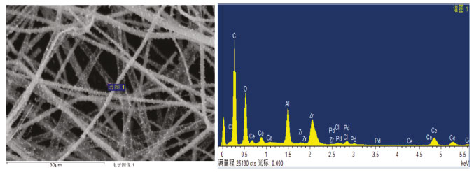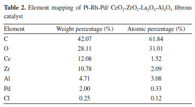 Figure 5 shows the EDS diagram of Pt-Rh-Pd / CeO2-ZrO2-La2O3-Al2O3 fibrous catalysts. It can be seen from the figure that a large amount of particles evenly distribute on the catalyst surface. In order to determine the composition of particles on the surface of the catalyst, the surface particles are analyzed applying EDS. From Figure 5, it is found that the content of Pd species in the particles is large, which proves that the Pd species can finely adhere to the surface of the fiber. Table 2 shows the element mapping of Pt-Rh-Pd / CeO2-ZrO2-La2O3-Al2O3 fibrous catalyst. As displayed in Table 2, the main components of the fiber are Al, Ce and Zr, while Pt, Rh and La are not detected, which may be attributed to the low content of Pt, Rh and La. It proves that Pt, Rh and La species are highly dispersed on the support materials.