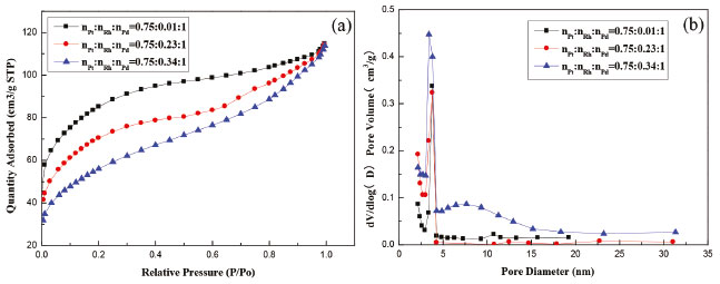 The texture properties of Pt-Rh-Pd / CeO2-ZrO2-La2O3-Al2O3 fibrous catalyst are shown in Table 3. N2 adsorption-desorption isotherms (a) and pore size distribution (b) of Pt-Rh-Pd / CeO2-ZrO2-La2O3-Al2O3 fibrous catalyst are shown in Figure 6. It is noticed from Table 1 that the pore diameter of the Pt-Rh-Pd / CeO2-ZrO2-La2O3-Al2O3 fibrous catalyst ranges from 2.42 nm to 4.68 nm, indicating that the fiber mainly belongs to the mesoporous material. The catalyst prepared with Pt Rh and Pd molar ratio of 0.75:0.01:1 has a maximum specific surface area of 301.5816 m2 g-1. With the increase of Rh content, the specific surface area of the catalyst gradually decreases, while the pore diameter gradually increases. When the molar ratio of Pt Rh and Pd is 0.75:0.34:1, the pore diameter of the catalyst is 3.54 nm.