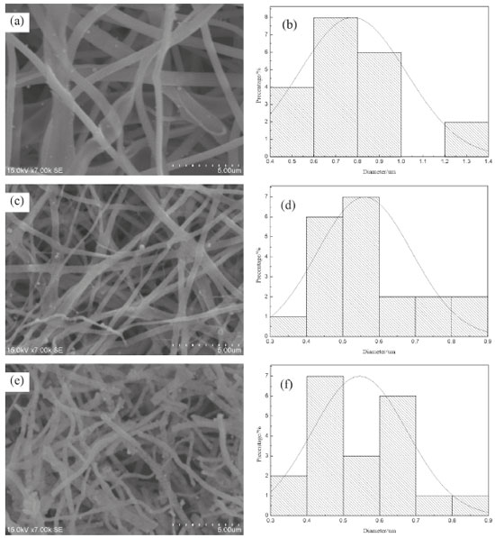 ![]() Figure 7. SEM images and diameter distribution histograms of Pt-Pd / CeO2-ZrO2-La2O3-Al2O3 fibrous catalysts ((a) 0.35%PtCl4, (c) 0.50%PtCl4, (e) 0.65%PtCl4)