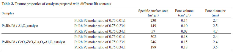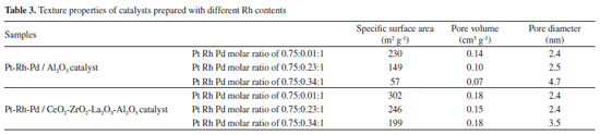 School of Mechanical Engineering, Nantong University, 226019 Jiangsu Nantong, China Recebido em 06/04/2020 *e-mail: swg13962801659@163.com In order to increase the specific surface area of Pt-Rh-Pd / Al2O3 automotive three-way catalyst and improve its low-temperature reduction performance, Ce, Zr, and La were added to the Pt-Rh-Pd / Al2O3 catalyst to prepare the fibrous Pt-Rh-Pd / CeO2-ZrO2-La2O3-Al2O3 catalyst via an electrospinning technique. The fibrous catalysts were characterized by XRD, FT-IR, SEM-EDS, H2-TPR and BET analysis. The catalytic effect of the catalyst on automobile exhaust was also studied. Results revealed that the surface of catalysts is mainly mesoporous. Ce, Zr and La can remarkably increase the specific surface area of the Pt-Rh-Pd / Al2O3 catalyst. The specific surface area of the catalyst prepared with Pt Rh Pd molar ratio of 0.75:0.01:1 is 301.5816 m2 g-1, and the average diameter of which is 790 nm. In addition, the reaction temperature of the catalyst is approximately 220 °C, which shows good low-temperature reduction performance. Moreover, the Pt-Rh-Pd / CeO2-ZrO2-La2O3-Al2O3 catalyst has a catalytic conversion efficiency for NOX of 90.0% in automobile exhaust, a catalytic conversion efficiency for CO of 88.8%, and a catalytic conversion efficiency for SO2 of 75%. INTRODUCTION With the rapid growth of the number of automobiles in the world, hydrocarbons (HC), carbon monoxide (CO) and nitrogen oxides (NOX) in automobile exhausts have increasingly polluted the air of cities.1-3 Automotive exhaust purification catalyst is essential for controlling exhaust pollution.4,5 Automobile exhaust purification catalyst carrier is generally composed of rare earth oxygen storage material and Al2O3 with high specific surface area, strong heat resistance and aging resistance.6-11 As is well known, high-performance rare earth oxygen storage material is a key component of automobile exhaust purification catalyst,12-14 which determines the catalytic performance and life of catalyst. As a consequence, improving the oxygen storage performance, specific surface area and thermal stability of the carrier are the main directions for the development of high-performance automotive exhaust purification catalyst. Since the 1980s, CeO2-ZrO2-Al2O3 carrier has shown excellent oxygen storage performance in automotive exhaust purification catalyst.15 CeO2-ZrO2-Al2O3 carrier remarkably improves the dispersion of active components on the surface of the carrier and catalytic activity.16,17 In addition, CeO2-ZrO2-Al2O3 carrier can enhance the anti-poisoning ability of automobile exhaust evolution catalysts.18 It is beneficial to promote the water vapor conversion and steam reforming reactions and improve the catalytic conversion efficiency of the catalyst.19 However, CeO2-ZrO2-Al2O3 carrier is easy to sinter at high temperature, which causes its specific surface area to drop sharply and results in a significant decrease in its oxygen storage / release performance. Moreover, CeO2-ZrO2-Al2O3 carrier cannot fully adapt to the high temperature working state of automobile exhaust purification catalyst. It was found that the incorporation of Pr, Y, Nd plasma could obviously promote the high temperature stability of CeO2-ZrO2-Al2O3 support and strengthen the sintering resistance of the catalyst.20 The performance of the carrier affects not only the dispersion of precious metals, but also the high temperature stability of the catalyst.21 Therefore, the preparation of carrier with high temperature stability and high oxygen storage capacity has become one of the important means to improve the catalytic effect of three-way catalysts. The precious metals such as Pt, Pd and Rh are the mainly active components of the three-way catalyst.22 Reducing the amount of precious metals while enhancing the low-temperature catalytic activity and high-temperature thermal stability of the catalyst are the main goals of the catalyst development. In recent years, electrospinning technology can easily and effectively prepare nano to sub-micron fibers, which has been widely applied in catalyst research.23-25 The polymer prepared by electrospinning has a relatively controllable chemical environment and structure on the surface, which can be used to prepare nanoparticle catalysts with extremely high dispersion and large specific surface area.26 The fiber catalyst prepared via electrospinning can effectively solve the problems of difficult aggregation, shedding and deactivation of catalytically active particles.27 The impregnation method is a common method for preparing automobile exhaust purification catalysts. However, the catalyst prepared by the impregnation method exists problems of poor catalytic performance at low temperature and metal particles' sintering at high temperature, which seriously diminishes the catalytic activity and shortens the life of catalysts. In this study, Ce, Zr, and La were added to the Pt-Rh-Pd / Al2O3 catalyst to prepare the fibrous Pt-Rh-Pd / CeO2-ZrO2-La2O3-Al2O3 catalyst via an electrospinning technique. The fibrous catalysts were characterized by XRD, FT-IR, SEM-EDS, H2-TPR and BET analysis to study their microstructural and compositional evolution. This work provides a simple route to improve the catalytic performance for CO and NOX in automobile exhaust.