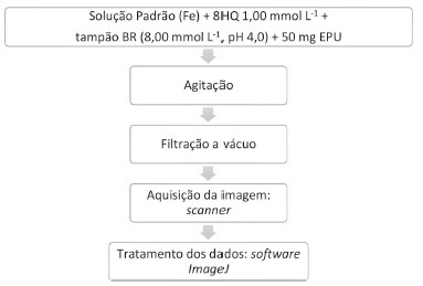 PARTE EXPERIMENTAL Instrumentação O scanner HP Photosmart C4780 foi empregado para a obtenção das imagens digitais, e os dados gerados foram tratados com o software gratuito ImageJ (National Institutes of Health, EUA). As imagens digitais foram adquiridas com resolução de 200 dpi. Medidas espectrométricas de absorção atômica em chama foram realizadas para comparação entre os métodos desenvolvido e de referência com o espectrômetro Shimadzu AA 6200. Todas as soluções empregadas nesse trabalho foram preparadas com o auxílio do sistema purificador de água Sartorius Arium Pro (Alemanha), que fornecia água deionizada com resistividade de 18,2 MΩ cm Reagentes Solução estoque de ferro 1,00 mmol L-1 foi preparada a partir de diluição de solução padrão de ferro (Merck, Alemanha) de concentração 1000 mg L-1. Solução estoque de 8-hidroxiquinolina de concentração 0,100 mol L-1 foi preparada a partir da solubilização do sólido (Vetec, Brasil) em acetona (Merck, Alemanha). Tampão Britton-Robbinson (BR) 0,080 mol L-1 foi preparado como sugere a literatura58 a partir de ácido acético, bórico e fosfórico (Merck, Alemanha). Solução de cloreto de sódio foi preparada a partir de solubilização do padrão (Vetec, Brasil) em água deionizada. A espuma de poliuretano (ORTOBOM, Brasil) empregada apresentava densidade de 0,09 mg mm-³ e foi caracterizada como tipo poliéter por espectro de infravermelho. A espuma foi previamente misturada a etanol comercial e triturada em liquidificador. Em seguida, foi seca ao ar livre e moída com o auxílio de moinho de bolas, a fim de aumentar sua área superficial e homogeneidade e, assim, melhorar a reprodutibilidade dos resultados. Procedimento experimental Obtenção do sinal analítico Os experimentos relativos ao método proposto foram realizados transferindo-se para balões volumétricos de 10,00 mL alíquotas da solução padrão contendo ferro, o ligante 8-Hidroxiquinolina em concentração final de 1,00 mmol L-1 e o tampão Britton Robinson em concentração final de 8,00 mmol L-1 em pH 4,0. Em seguida, essa solução era vertida em tubo de polipropileno contendo 50 mg da EPU. A mistura era então agitada em mesa por 45 minutos a 100 rpm. Por fim era filtrada a vácuo, utilizando-se uma ponteira plástica cortada como molde. As imagens digitais das EPU contendo o complexo eram adquiridas com o auxílio de um scanner e tratadas pelo software Image J. Na Figura 1 encontra-se um fluxograma elucidativo desse procedimento.